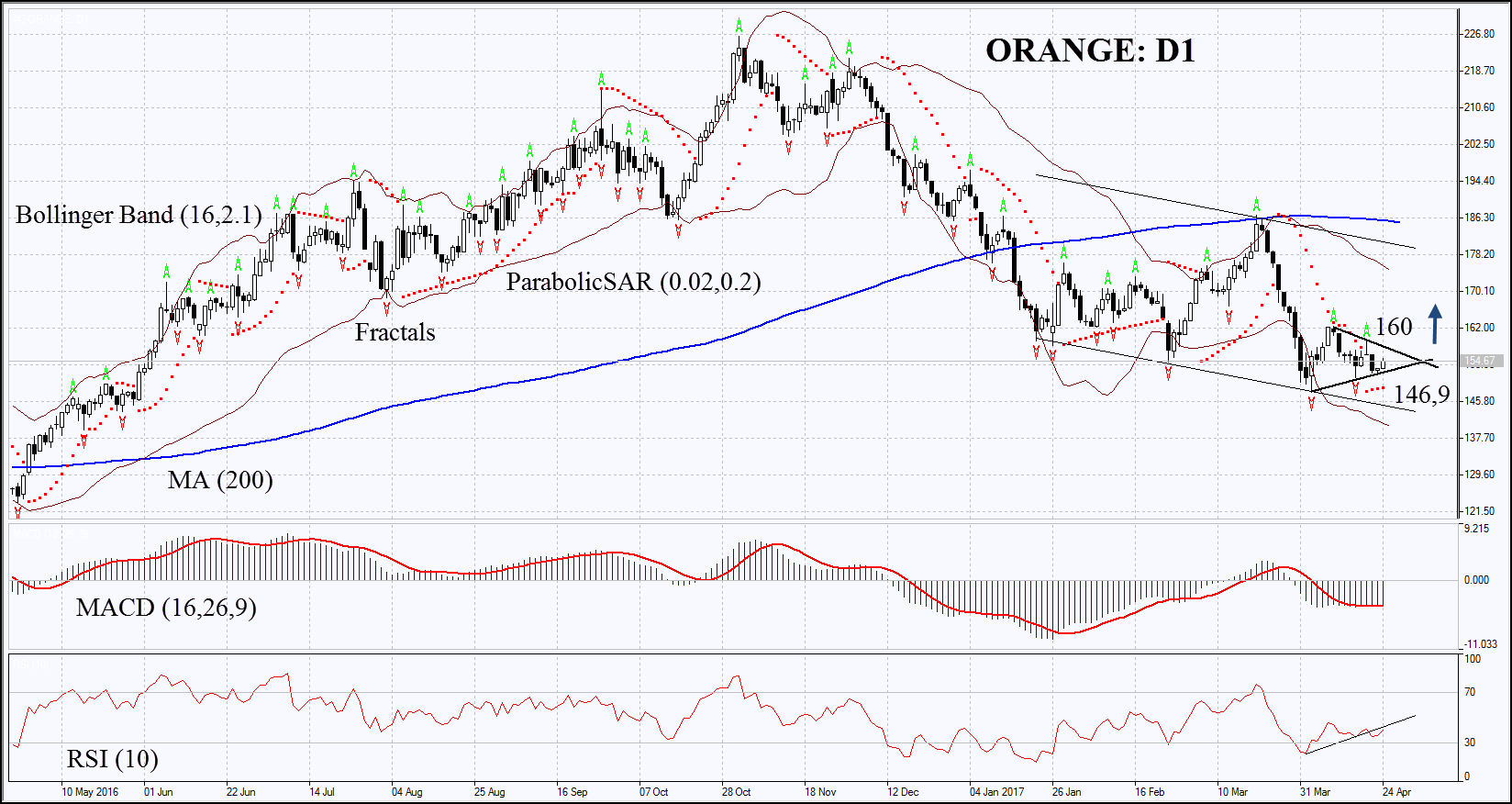 The bullish momentum may develop in case ORANGE surpasses the last fractal high at 160. This level may serve as the point of entry. The initial stop-loss may be placed below the 11 – month low, the last two fractal lows and the Parabolic signal at 147, 9. After opening the pending order, we shall move the stop to the next fractal low following the Parabolic and Bollinger signals. Thus, we are changing the probable profit/loss ratio to the breakeven point. The most risk-averse traders may switch to the 4-hour chart after the trade and place there a stop-loss moving it in the direction of the trade. If the price meets the stop-loss level at 147, 9 without reaching the order at 160, we recommend cancelling the position: the market sustains internal changes which were not taken into account.