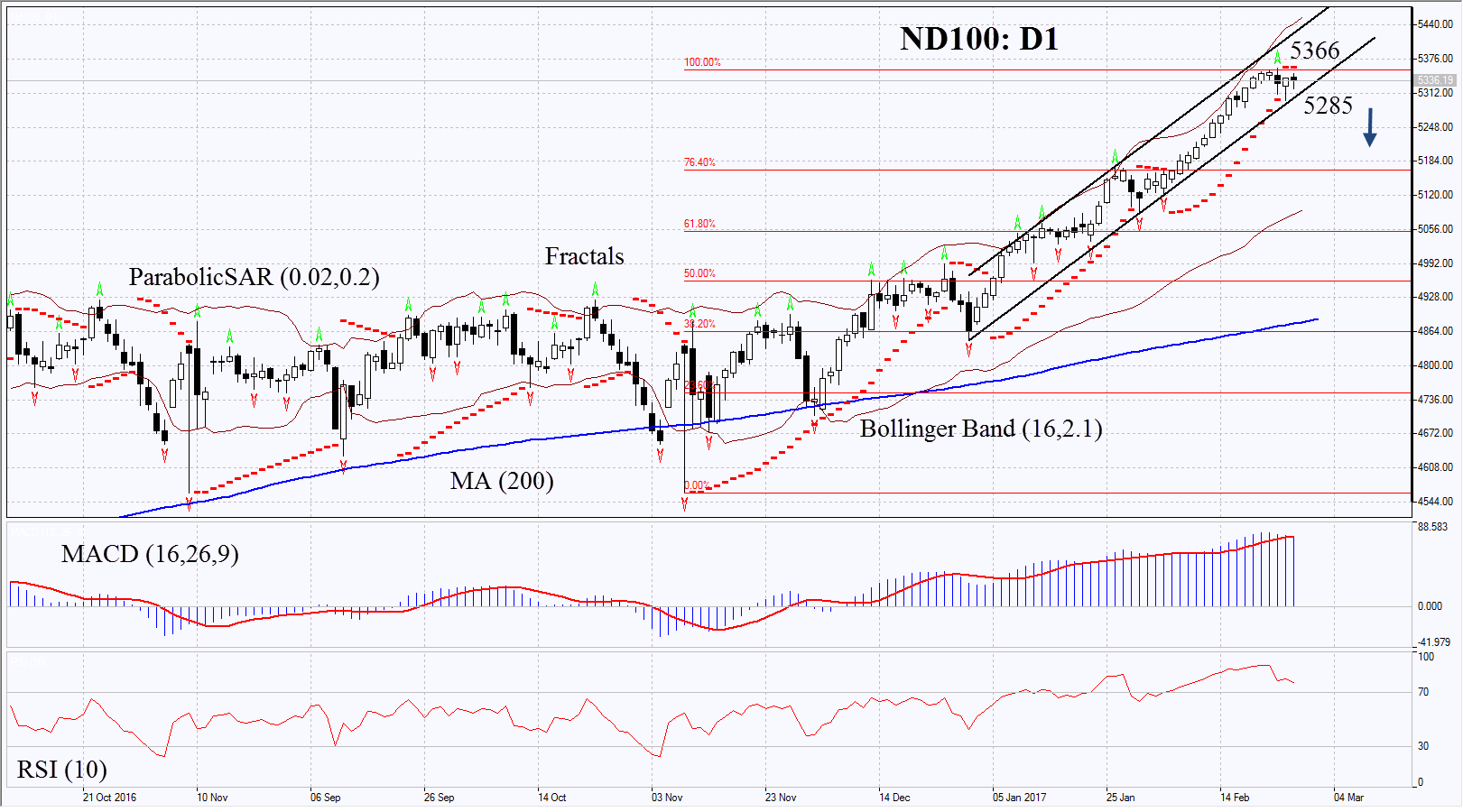 Donald Trump is expected to present the details of his law reform and infrastructure projects. Their main aim is to stimulate the US production by massive tax cuts on businesses and individuals. US stock indices previously were advancing almost without retracements and have repeatedly hit their fresh historical highs. Investors were optimistic on the economic program of the US president. Nevertheless, the disclosure of the details may make them book profits. The program realization may begin in the 2nd part of 2017. As the US saying goes, “buy rumours – sell facts”. On Tuesday many significant US economic indicators will come out which may affect the markets. At 16-30 СЕТ the Q4 2016 GDP will come out in 2nd reading, as well as the trade balance and wholesale stocks for January. At 18-00 СЕТ the consumer confidence index for February will come out. We believe that the tentative outlook is mostly positive. Thus, Nasdaq 100 may retrace in case the real figures fall short of expectations or in case of negative reaction of the markets on the Trump’s policy.